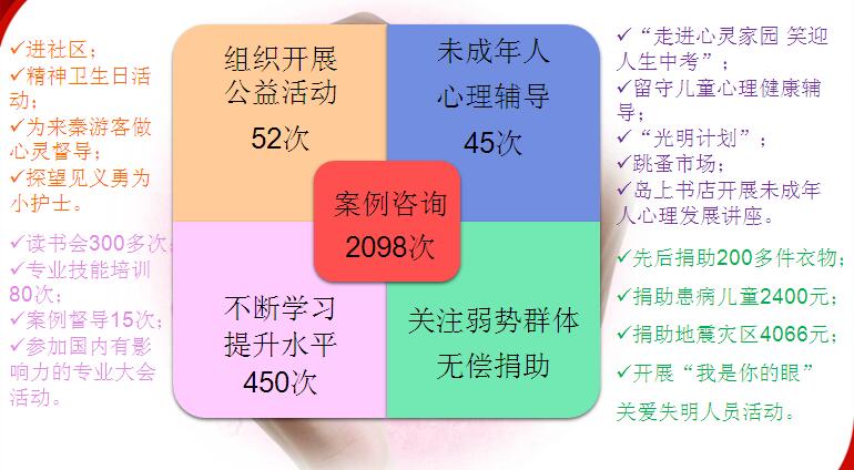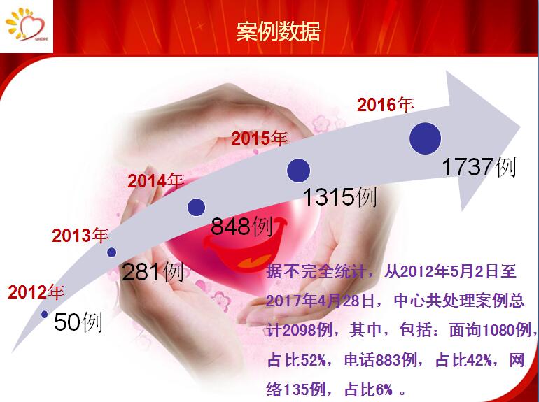 從上圖數(shù)據(jù)可以直觀的看出 自2014年開始,中心接受案例數(shù)據(jù)呈現(xiàn)大幅度增長(zhǎng),這要感謝秦皇島市海港區(qū)文明辦的大力支持;感謝各界媒體的關(guān)注和宣傳。
