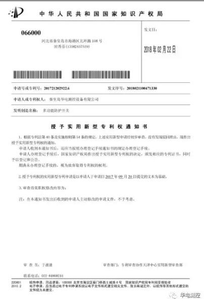 【企業(yè)要聞】公司申請的“多功能防護開關(guān)”專利授權(quán)