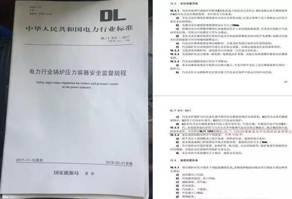 中華人民共和國電力行業(yè)標準《電力行業(yè)鍋爐壓力容器安全監(jiān)督規(guī)程》(DL/T 612-2017)(替代DL612-1996)于2017年11月15日由國家能源局發(fā)布,并于2018年3月1日實施。此規(guī)程規(guī)定了電力行業(yè)鍋爐壓力容器安全監(jiān)督要求,并在“10.安全保護裝置及儀表中10.3水位測量系統(tǒng)”引用了《火力發(fā)電廠鍋爐汽包水位測量系統(tǒng)技術規(guī)程》(DL/T1393-2014)部分內(nèi)容進行系統(tǒng)闡述。