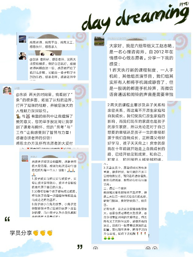 課程結(jié)束后看到大家都在群里分享自己的感想與收獲,讓我想起開課前臨時邀請擔(dān)任主持人,當時的心情特別矛盾。有興奮,第一次上臺當主持對自己是個很大的挑戰(zhàn);有心虛,非常不自信覺得自己做不好;有糾結(jié),因為孩子還有兩天時間就期末考試。最后我還是決定抓住機會,做自己想做的,相信越努力越幸運,于是我就這樣在沒有任何準備的情況下做了兩天的主持人。