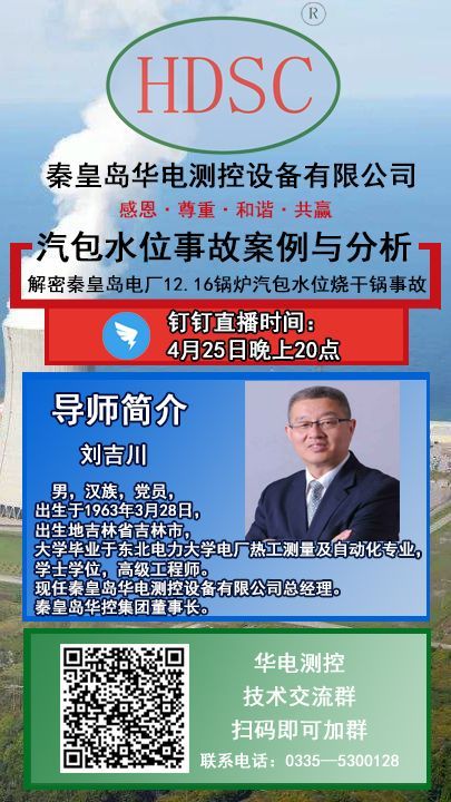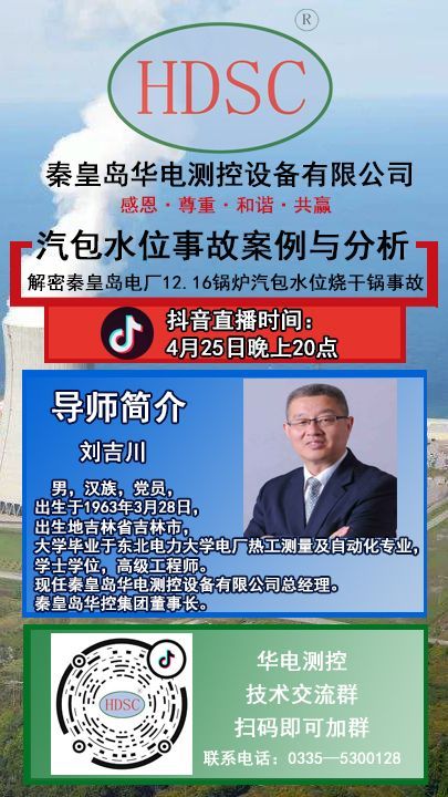 2020年4月25日晚8時(shí),秦皇島華控集團(tuán)有限公司董事長(zhǎng)劉吉川先生攜手【熱控圈】舉辦“火力發(fā)電廠鍋爐汽包水位測(cè)量系統(tǒng)系列講座之解密秦皇島電廠12.16鍋爐汽包燒干鍋事故”。“千聊”、“抖音”、“釘釘”軟件同步直播。