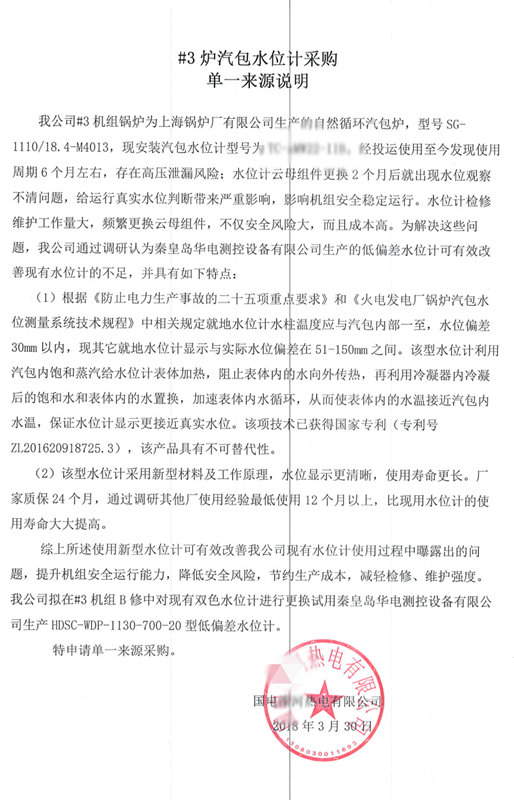 該電廠擁有3臺300MW火力發(fā)電機組,2005年投產運行。由于汽包水位測量系統(tǒng)測量偏差較大,存在了嚴重的安全隱患。在2018年采用了我公司的專利產品高精度云母水位計后,解決了原有水位測量不準確的問題,為日后的安全運行工作帶來了保障。