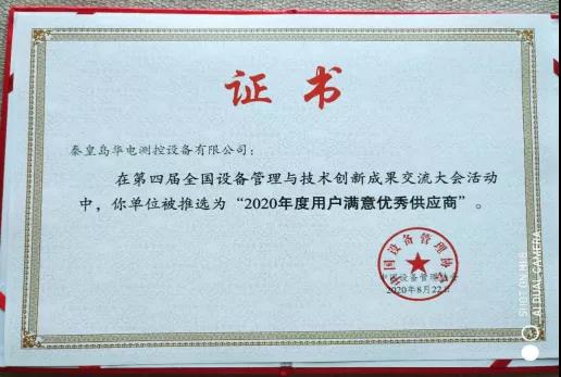 2020年8月22日,秦皇島華電測控設備有限公司應中國設備管理協(xié)會邀請,參加2020年第四屆全國設備管理與技術創(chuàng)新成果交流大會。并被推薦為“2020年度用戶滿意優(yōu)秀供應商”。