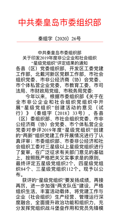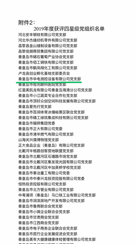 2020年,中共秦皇島華電測控設備有限公司支部委員會通過自下而上的方式申報至上級街道黨工委,上級黨工委指派專人到基層組織進行測評、考評,經(jīng)黨委會議評定并公示后確定評星等級,授星,我公司支部委員會被評定為四星級黨組織。