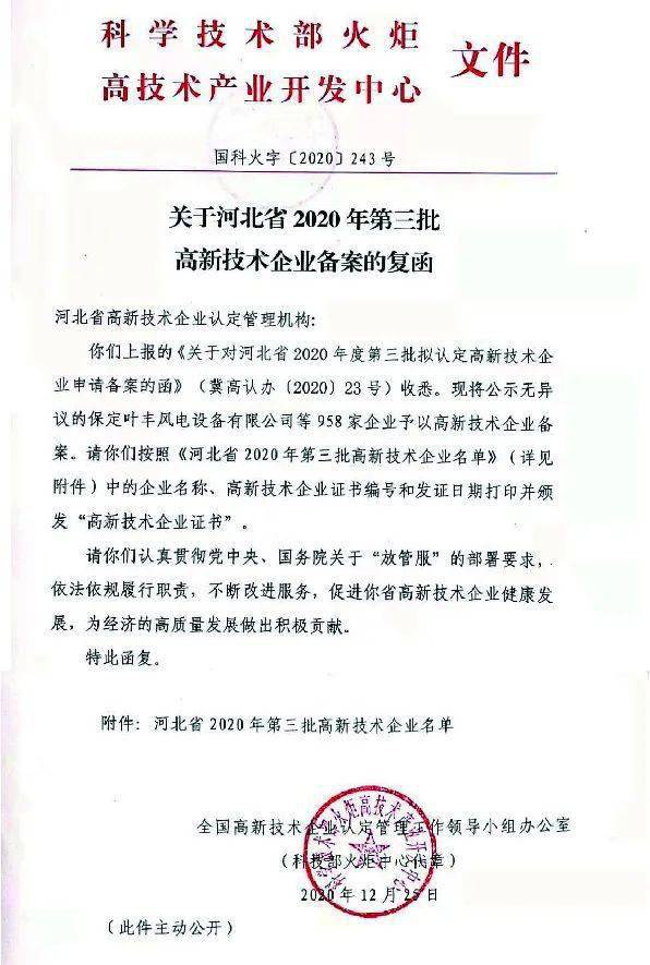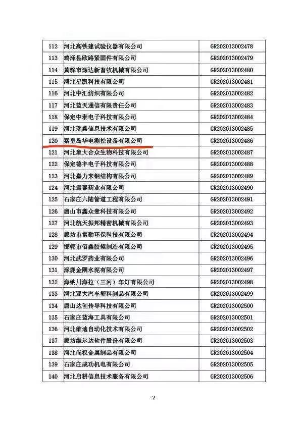 近日,秦皇島華電測控設備有限公司收到了全國高新技術企業(yè)認定管理工作領導小組辦公室下發(fā)的《關于河北省2020年第三批高新技術企業(yè)備案的復函》(國科火字〔2020〕243號〕文件,公司第六次順利通過高新技術企業(yè)認定。