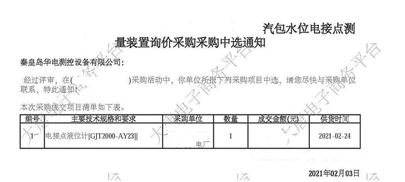 2021年2月3日,我公司在大唐集團安徽某電廠的電接點液位計改造項目的競標(biāo)中,憑借強大的綜合實力以及過硬的產(chǎn)品質(zhì)量,通過層層篩選、激烈角逐,以絕對的優(yōu)勢順利中標(biāo)。