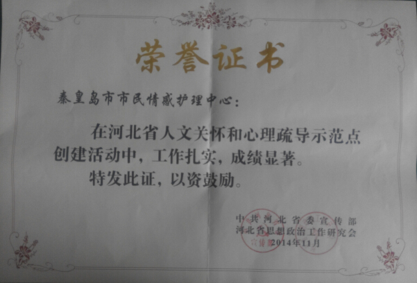2014年11月,秦皇島市市民情感護理中心在河北省人文關(guān)懷和心理疏導示范點創(chuàng)建活動中,工作扎實,成績顯著,喜獲中共河北省委宣傳部、河北省思想政治工作研究會頒發(fā)的榮譽證書。