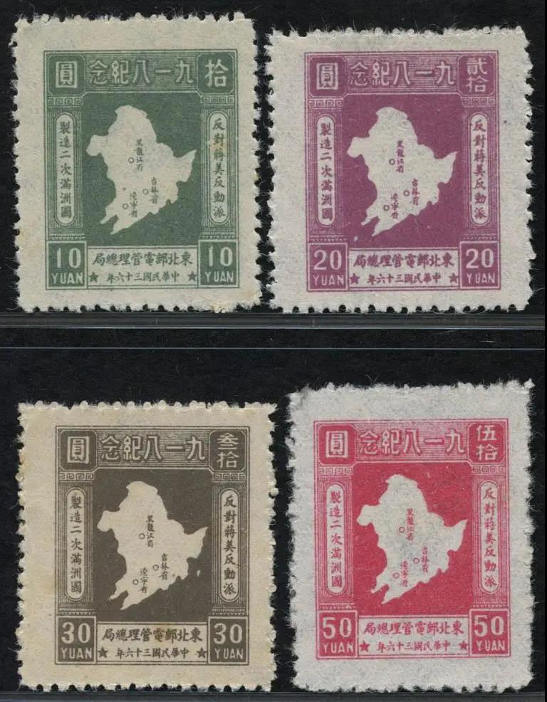 該套郵票一套4枚,圖案相同,就是刷色和面值各異。郵票的圖案主體為中國東北三省地圖,圖中明確標(biāo)明三省省會的位置和各省名稱。圖案上方印刷郵票主題―“ 九一八紀(jì)念”,下方印刷“ 東北郵電管理總局★中華民國三十六年★”發(fā)行單位和發(fā)行時間,左右兩側(cè)印刷當(dāng)時的口號“ 反對蔣美反動派,制造二次滿洲國”。這套郵票是由哈爾濱廣發(fā)印刷所承印,特別值得一提的是,該套郵票所用的紙張系為原偽滿洲國郵政局遺留庫存的水印絹絲紙,這也是“九一八事變”之后日本侵略者侵占了東北三省長達(dá)14年的證據(jù)之一(當(dāng)時庫存之大,甚至到建國后,新中國發(fā)行的東普二也使用這款“ 水印紙 ”)。