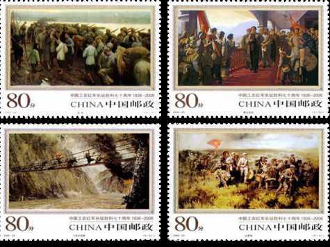 遵義會(huì)議作為紅軍長(zhǎng)征途中的重要會(huì)議,也曾出現(xiàn)在2006年10月22日發(fā)行的《中國(guó)工農(nóng)紅軍長(zhǎng)征勝利七十周年》的紀(jì)念郵票1套4枚中。志號(hào):2006-25,設(shè)計(jì)者:郝旭東。畫作者:靳尚誼(4-1)、彭 彬(4-2)、劉國(guó)樞(4-3)、張文源(4-4)、李寶林周順愷(小型張)。