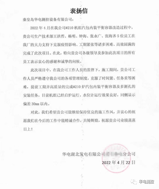 在改造過程中,我公司生技部工程技術(shù)人員王洪哲、楊明、鐘海、張永廣、張海齊等5位員工在電廠的大力支持下克服疫情影響、工期緊張等諸多困難,嚴(yán)格遵守電廠各項(xiàng)管理制度,高效圓滿地完成了此次項(xiàng)目,得到廠內(nèi)領(lǐng)導(dǎo)的一致好評(píng),并發(fā)來表揚(yáng)信。