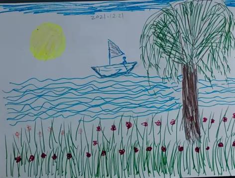 另一幅畫的作者,說自己畫這畫時,心里感覺可幸福了。坐在小船里的人就是自己,正在大海中徜徉。海岸上有很多的花兒開放著,還有一顆大樹。當然還有自己的愛人和孩子,藍藍的天空,一個大大的太陽。