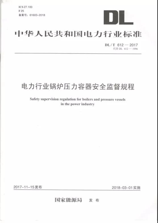 中華人民共和國電力行業(yè)標(biāo)準(zhǔn)DL/T 612-2017《電力行業(yè)鍋爐壓力容器安全監(jiān)督規(guī)程》(替代DL612-1996)于2017年11月15日由國家能源局發(fā)布,并于2018年3月1日實(shí)施。此規(guī)程規(guī)定了電力行業(yè)鍋爐壓力容器安全監(jiān)督要求,并在“10.安全保護(hù)裝置及儀表中10.3水位測量系統(tǒng)”引用了《火力發(fā)電廠鍋爐汽包水位測量系統(tǒng)技術(shù)規(guī)程》(DL/T1393-2014)部分內(nèi)容進(jìn)行系統(tǒng)闡述。