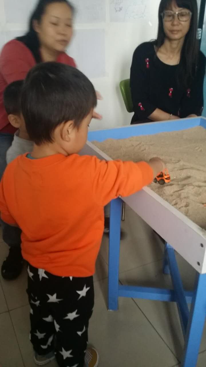 似懂非懂的我?guī)е鞣N的擔心,擔心孩子小還不到3歲,比較淘氣,會不會可哪亂跑?會不會把玩具弄壞?會不會弄得沙子哪都是?會不會耍賴?帶著各種擔心和不確定來到了情感護理中心,劉伶華老師和肖艷玲老師接待了我們,給我們說了一下活動的方向和注意事項,活動就開始了。老師們認真的觀察和記錄,也讓我們這樣靜靜的觀察我的兒子,我兒子沒有因為環(huán)境的變化而不自在,剛說明活動內(nèi)容時,感覺兒子完全沒有在聽,可是他在活動時,凡事都試探著慢慢的在做,沒有亂跑,沒有亂弄玩具,沒有把沙子弄得哪都是,完全出乎我的意料,雖然沒有做出完整的沙盤,可是老師通過細致的觀察,從孩子的行動中,已經(jīng)看到了孩子的內(nèi)心。給我們分析了孩子的狀況,孩子哪方面發(fā)展的比較好,哪方面還有待提高,還給我們舉出很多案例供我們參考,“沙盤游戲”是個時時刻刻長期有效觀察孩子的活動,不同的時期會反映不同的效果,更真切的了解孩子的成長。