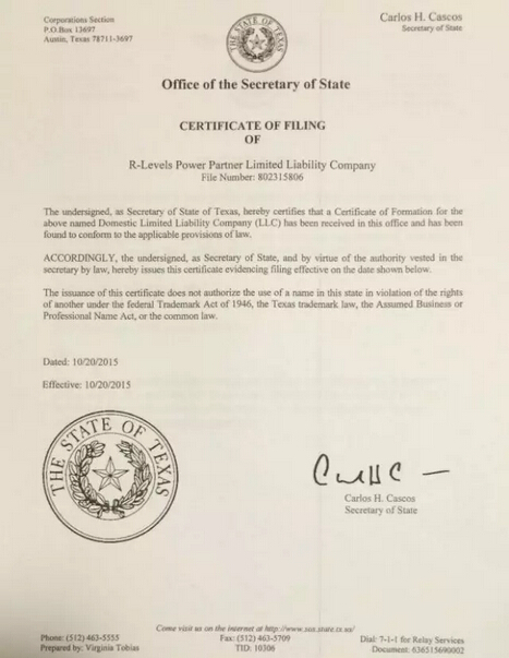 【企業(yè)要聞】喜訊:秦皇島華電測(cè)控設(shè)備有限公司美國(guó)分公司R-Levels Power Partner LLC完成注冊(cè)!