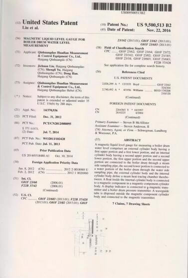 好消息:公司于2014年7月向美國(guó)提交的“汽包水位磁致液位計(jì)”發(fā)明專利申請(qǐng),經(jīng)過(guò)Director of the United States Patent and Trademark Office嚴(yán)謹(jǐn)認(rèn)真的審查,已經(jīng)于2016年11月22授予了發(fā)明專利權(quán),頒發(fā)了美國(guó)發(fā)明專利證書,專利號(hào)為:U.S.Patent No.9500513 B2。