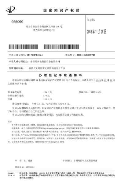 公司于2017年2月14日提交的“一種槽式太陽能聚光器鏡面的設(shè)計方法”(專利號:201710078246.4)專利已被中華人民共和國國家知識產(chǎn)權(quán)局授予發(fā)明專利權(quán)。此項專利的授權(quán),標志著公司已經(jīng)擁有43項自主知識產(chǎn)權(quán)。
