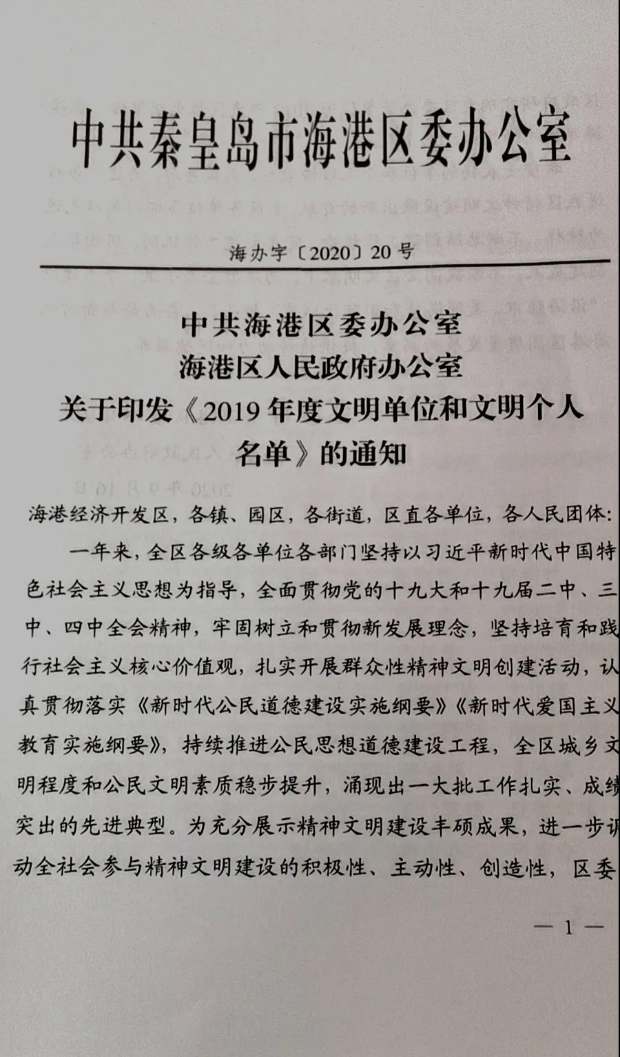 20204月,中共秦皇島市海港區(qū)委、區(qū)政府組織申報2019年度文明單位和文明個人,經(jīng)過推薦評審,近日獲悉華電測控榮獲文明單位稱號。
