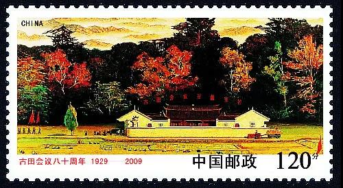 2009年12月28日上午,《古田會議八十周年》紀(jì)念郵票首發(fā)式在福建省龍巖市隆重舉行。福建省,中國郵政集團公司的領(lǐng)導(dǎo),以及龍巖市四大班子領(lǐng)導(dǎo)、福建省郵政公司領(lǐng)導(dǎo)和嘉賓出席了郵票首發(fā)式,并為《古田會議八十周年》紀(jì)念郵票首發(fā)揭幕?!豆盘飼h八十周年》紀(jì)念郵票一套一枚,面值1.2元,郵票圖案為著名畫家王路1972年的作品――《古田會議染層林》油畫。