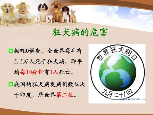 據(jù)世界衛(wèi)生組織在報(bào)告披露,狂犬病遍布于全世界,每年全球有55000人死于狂犬病,即每10分鐘就有1人死亡。此外,亞洲和非洲有1000萬(wàn)人在被可能患有狂犬病的狗咬傷后,接受狂犬病疫苗注射。為了喚起全球的重視,在國(guó)際狂犬病控制聯(lián)盟的倡議下,世界衛(wèi)生組織、世界動(dòng)物衛(wèi)生組織及美國(guó)疾病預(yù)防控制中心等共同發(fā)起并確定,每年的9月28日為世界狂犬病日。通過(guò)設(shè)立世界狂犬病日,將集合眾多的合作者和志愿者,群策群力,盡快使狂犬病成為歷史。第一個(gè)“世界狂犬病日”活動(dòng)之后,各國(guó)紛紛開展相應(yīng)宣傳活動(dòng),相關(guān)的各項(xiàng)活動(dòng)獲得里程碑式的成功,將全球的狂犬病預(yù)防和控制工作向前推進(jìn)了一大步。