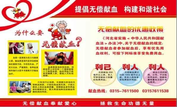 如今,無(wú)償獻(xiàn)血已經(jīng)成為了衡量一個(gè)社會(huì)文明程度的標(biāo)志,各個(gè)國(guó)家的政府都十分重視和關(guān)心無(wú)償獻(xiàn)血。每年的6月14日是世界獻(xiàn)血者日。設(shè)立這個(gè)世界獻(xiàn)血者日,是為他人著想,捐獻(xiàn)熱血,分享生命。世界上每秒鐘就有3個(gè)人需要輸血,血液的來(lái)源只能依賴于他人的捐獻(xiàn)。自愿無(wú)償獻(xiàn)血是唯一安全的血液來(lái)源,這是世界各國(guó)的共識(shí)。我們國(guó)內(nèi)的獻(xiàn)血一般是無(wú)償獻(xiàn)血。獻(xiàn)血是健康適齡的公民自愿獻(xiàn)出血液,去挽救他人生命,而不索取任何報(bào)酬的行為。提倡無(wú)償獻(xiàn)血,構(gòu)建和諧社會(huì)。關(guān)于無(wú)償獻(xiàn)血的意義: 生命離不開(kāi)血液,輸血是搶救危重病人的一種特殊醫(yī)療措施。在目前人造血液尚不能完全代替人體血液之時(shí),臨床用血只能靠健康人體捐獻(xiàn)。無(wú)償獻(xiàn)血是團(tuán)結(jié)友愛(ài)、無(wú)私奉獻(xiàn)精神的具體表現(xiàn),也是一種互救互助的方式。“獻(xiàn)血”最大好處就是可以救助病人,也是無(wú)償獻(xiàn)血者仁心義舉的表現(xiàn)。同時(shí)可促進(jìn)人體的新陳代謝,是一種利人利己的行為。而且,根據(jù)各地區(qū)的規(guī)定,獻(xiàn)血者及家庭成員還可以享受相應(yīng)的用血優(yōu)待政策。這也充分體現(xiàn)了社會(huì)主義社會(huì)人與人之間團(tuán)結(jié)互助和人道友愛(ài)的精神。無(wú)償獻(xiàn)血是一種無(wú)私奉獻(xiàn)、救死扶傷的崇高行為。獻(xiàn)血是一種愛(ài)心奉獻(xiàn)的體現(xiàn),可以使傷病患者解除病痛,甚至挽救他們的生命。這種價(jià)值是無(wú)法用金錢來(lái)衡量的。獻(xiàn)血是救人一命的高尚品行,在助人為樂(lè)的同時(shí),也能夠使自己的精神得到凈化。如果一個(gè)人擁有健康的情緒,就可以使人體免疫力增強(qiáng),抵抗力提高,使各個(gè)器官的功能處于一個(gè)良好的狀態(tài)。無(wú)償獻(xiàn)血是終身的榮譽(yù),獻(xiàn)血者也會(huì)受到社會(huì)的尊重和愛(ài)戴。這也是一項(xiàng)社會(huì)公益事業(yè)。我國(guó)鼓勵(lì)無(wú)償獻(xiàn)血的年齡是18-55周歲。