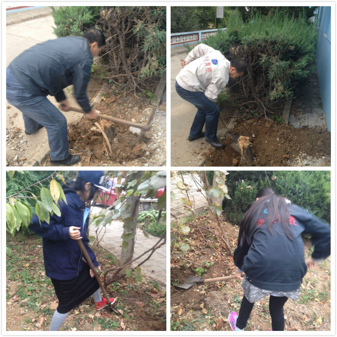 最后一組負(fù)責(zé)鏟除花壇中枯死的樹根,大家奮勇爭先、眾志成城,終于順利鏟除了花壇中的四個(gè)“根深蒂固”的老樹根。