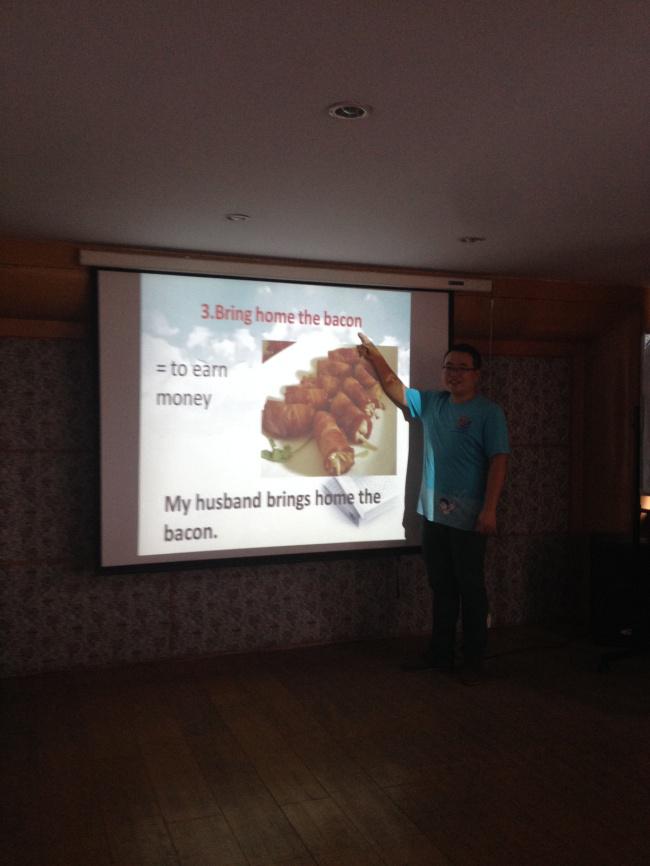 第一個環(huán)節(jié)大家學習了“與食物有關的俗語”。通過觀看大屏幕上吸引人的照片,他們學習了十個與食物有關的英語俗語。比如piece of cake(容易的事情), to go bananas(變瘋狂了), bring home the bacon(賺錢), have bigger fish to fry(有更重要的事情要做),like two peas in a pod(很相似), eat like a horse(很能吃), as red as a cherry(非常紅)……下一個環(huán)節(jié)是口語學習。這次他們學習了如何表達“感謝”和“對不起”以及如何回答別人的感謝和抱歉。在英語中我們有時可能會混淆回答“謝謝”和“對不起”的答語。在這個環(huán)節(jié)過后,大家對他們的區(qū)別有了更深的了解。最后他們做了一個簡單的測驗,檢驗一下他們是否在英語角有所收獲。